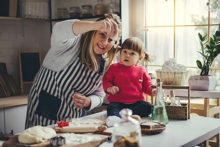 Fun family leisure in kitchen. Mother and daughter enjoying cooking together, working with dough, laughing.