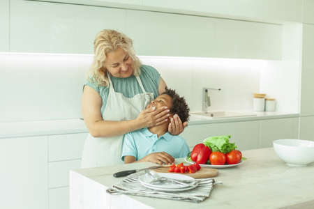 Mother and child bonding over cooking activities in a cozy kitchen setting