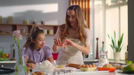 Portrait of mother and daughter cracking eggs in glass bowl on kitchen. Cheerful woman and small girl cooking on domestic kitchen in slow motion. Mom learning kid to cook a cake