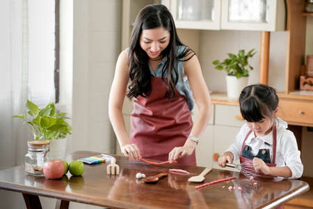 Asian mother and daughter play modeling clay together in kitchen with day light and they look happy. Concept of enjoy with family time of different age of member in their house.