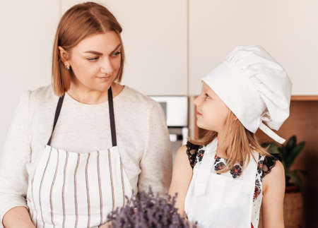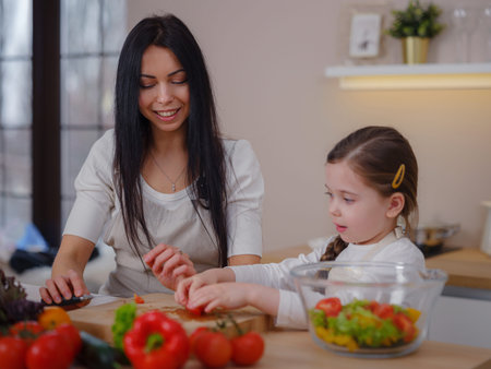 daughter mother kitchen food preparing cooking child bonding happy girl together home parent.