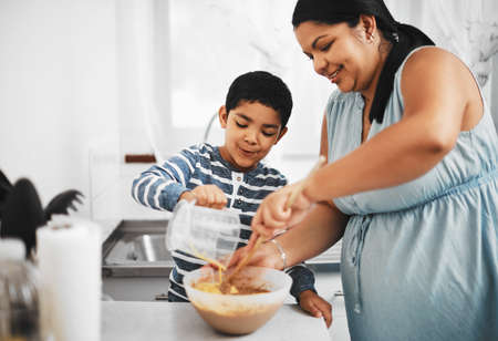 Kids can learn many skills by baking with parents. Shot of a mother and her little son baking together at home.