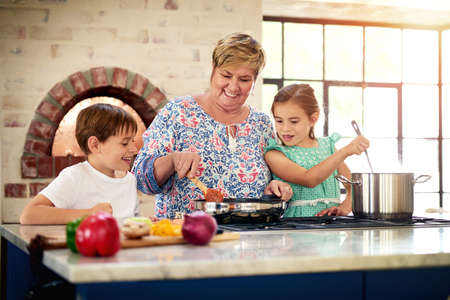 Grandma is so lucky to have two little eager helpers. Shot of a grandmother cooking with her two grandchildren at home.