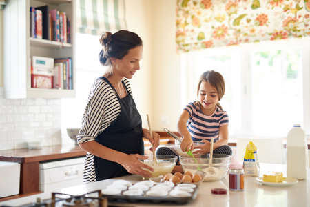 Making something sweet with mommy. a little girl baking with her mother in the kitchen.