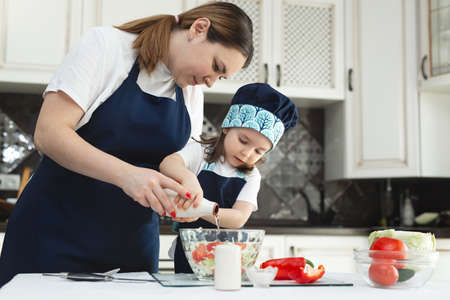 A caring mother teaches her little daughter how to prepare a salad in the kitchen, a young mother and a charming sweet baby girl dress up the salad, salt it and taste it