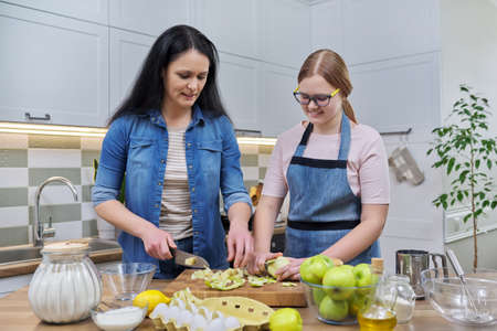 Mommy teaching her teen daughter to cook vegetable salad in kitchen
