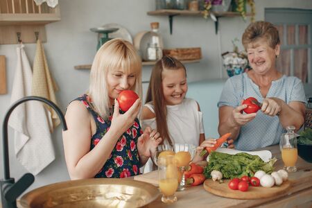 Healthy food at home. Happy family in the kitchen. Grandma, mother and child daughter are preparing the vegetables and fruit.