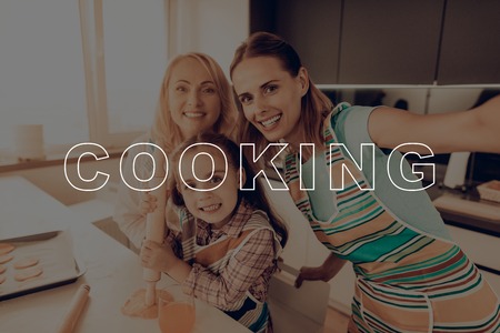 Make a Cookies. Close Up. Woman. Elderly. Girl. Do Selfie. White. Smartphone. Kitchen. Happy Family. Have Fan. Together at Home. New Technology. Thanksgiving Day. Autumn Feast. Celebrating Holiday.