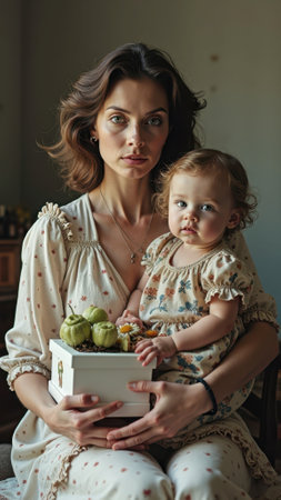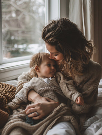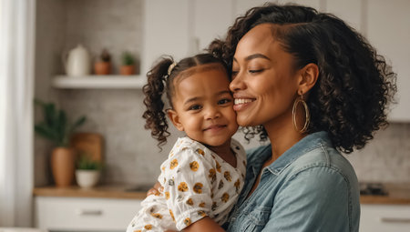 A woman holds a baby, their foreheads touching in a tender moment. The scene is illuminated by gentle natural light, creating a warm, intimate atmosphere. The composition emphasizes the connection between the mother and child. It is suitable for illustrating themes of family, love, and care. Potential applications include editorial and commercial projects.