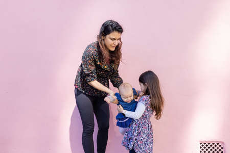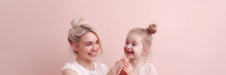 mom and daughter laughing and holding hands on a pink background, in the style of poster, delicate portraits. Banner