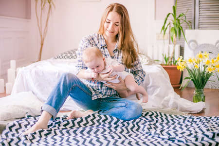 portrait of young mother with her baby at home, living a real interior , Mom and son embrace, toning