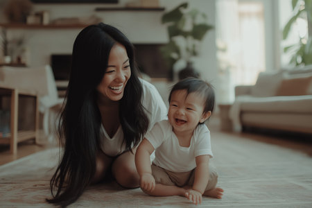 Cheerful Asian woman plays with toddler on a living room floor in a modern minimalistic setting