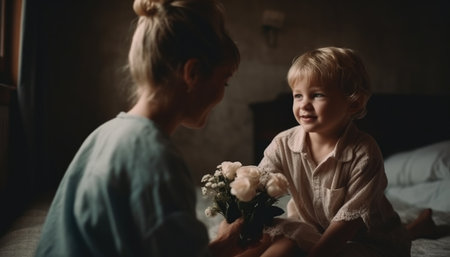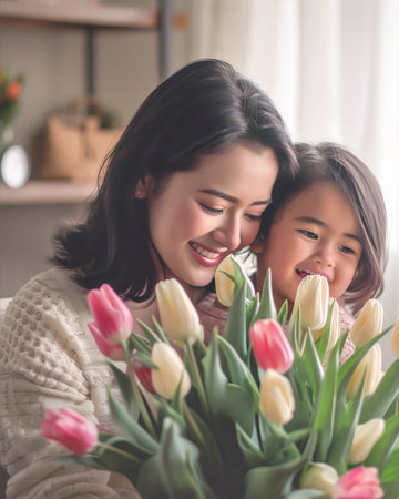 Smiling mother and daughter enjoying a beautiful bouquet of tulips in a cozy indoor setting, capturing the essence of love and family bonding, floral arrangement concept