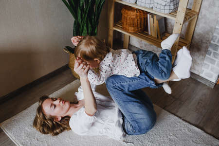a happy and caring young mother plays with her little daughter. happily spend time with your child