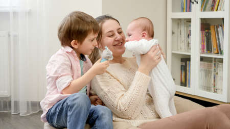 Little boy with mother playing with newborn baby brother and rattle toy. Parenting, children happiness and family relationship
