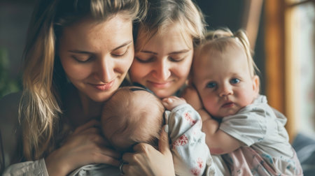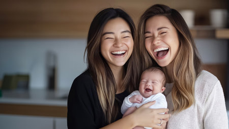 Two mothers are sharing a happy moment while holding their newborn baby at home