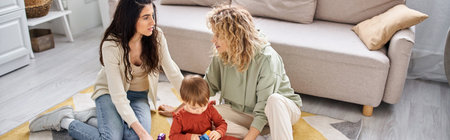 happy lesbian couple playing with toys with their toddler daughter at home, modern parenting, banner