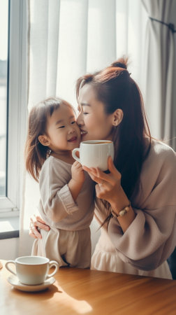 Generative AI : Young loving mother and happy cute little girl daughter with closed eyes cuddling while drinking tea in modern cozy kitchen older and younger sister enjoying tender