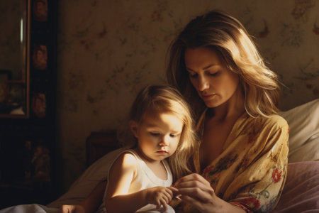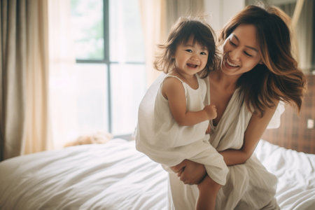 Generative AI : Happy family mother and child daughter play and laughing in bed