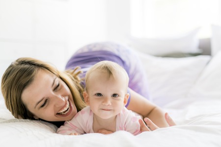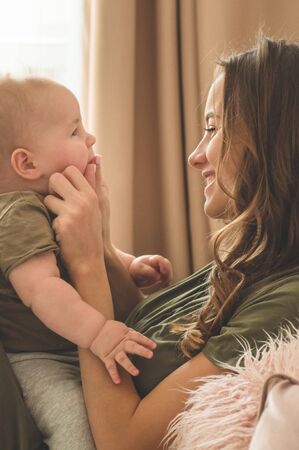 Home portrait of a baby boy with mother on the bed. Mom holding and kissing her child. Mother day concept