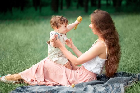 Young beautiful mother sitting with her little son against green grass. Happy woman with her baby boy on a summer day. Family walking on the meadow.