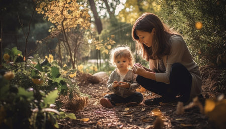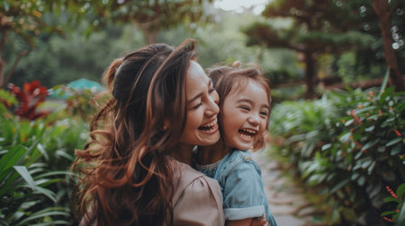 Mother and child spending quality time together in a natural setting, such as a park or garden. Mother's Day.