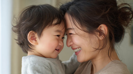 Motherly Affection Concept: Close Up Portrait of an Affectionate Asian Mother Touching Noses with her Baby in a Cosy Naturally Lit Bedroom. Warm Atmosphere Reflecting