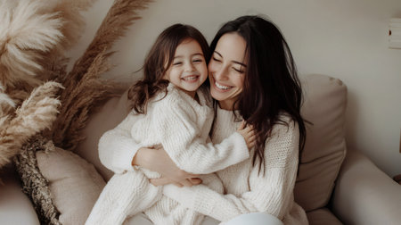 Celebrating the loving bond between a mother and her daughter, sharing a heartwarming hug on a comfortable sofa in a cozy home setting, creating a beautiful moment of togetherness and affection