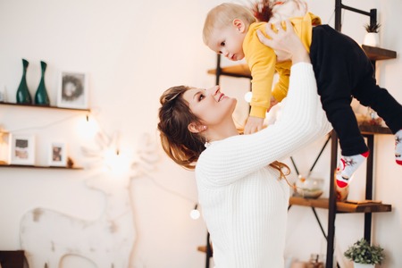 happy young beautiful woman mother with a small child in her arms hugging celebrate New Year and Christmas in a festive atmosphere