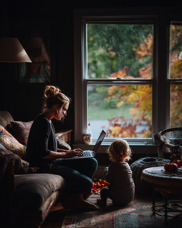 Family Images collection for creating relatable Instagram highlights, family moments, mother and child doing activities together, natural light from the side.