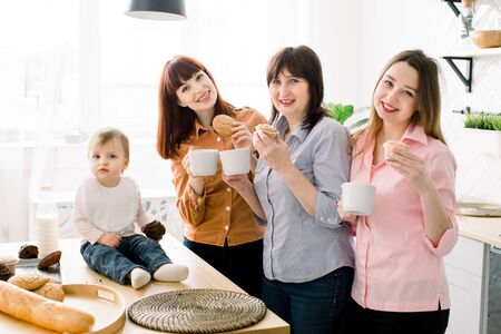 Cheerful smiling attractive young women, middle aged woman and little cute baby girl eating cookies and cupcakes and drinking coffee at home kitchen. Happy Mothers Day concept, cooking together