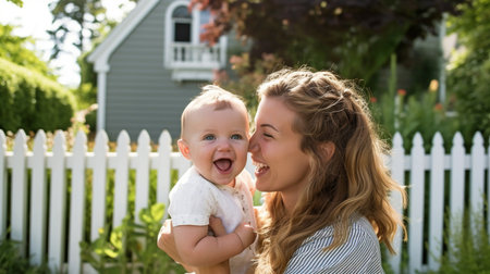 As her mother kisses her cheek, the baby smiles. Generative AI with a background of white picket fence