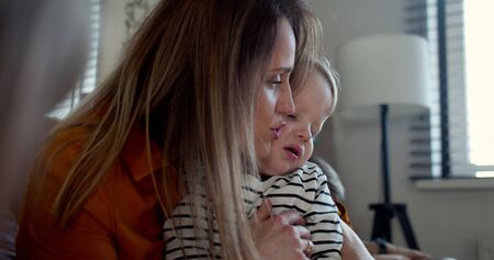 Close-up happy young beautiful Caucasian mother hugging sad baby boy child on the couch, he smiles again slow motion.