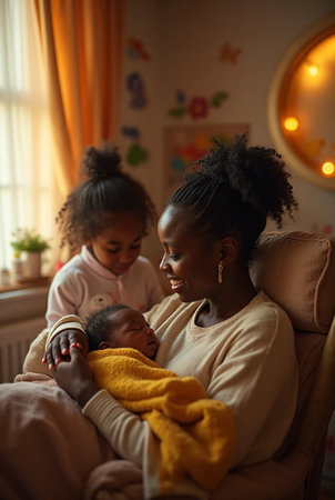 A tender moment captured as a mother gazes at her newborn baby with love and affection, bathed in warm sunlight filtering through a window.