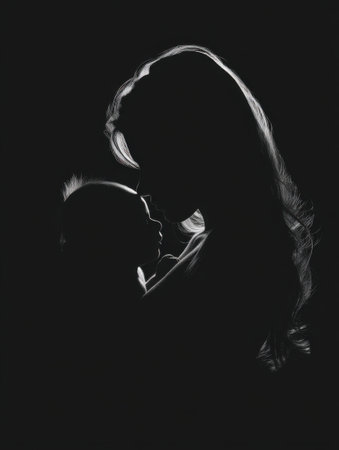 A mother lovingly gazes at her baby in a silhouette against a dark backdrop, capturing a beautiful emotional bond between them.