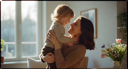 A mother embraces her young child in a warm indoor space, highlighting their affectionate bond and joyful interaction in the morning light.