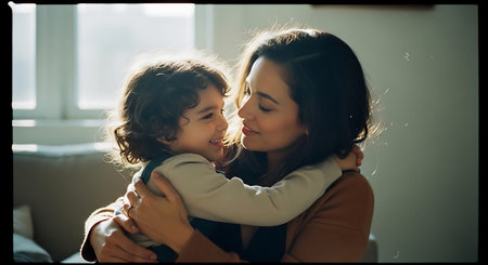 A mother and young child share a tender moment, hugging closely in a well-lit room with natural sunlight streaming through a window.