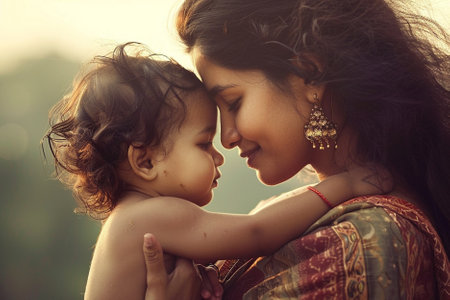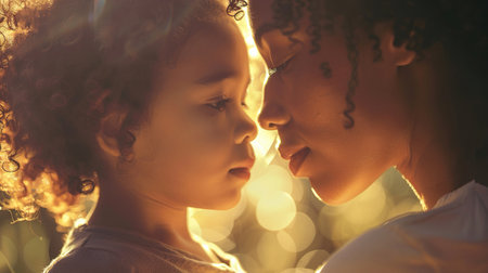 In a serene moment, a mother gently touches foreheads with her young child, both closing their eyes to savor the warmth and connection in a softly lit atmosphere.