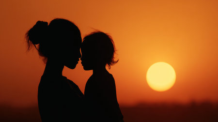 Silhouetted against a golden sunset, a mother holds her child close, showcasing a moment of love and connection amidst a tranquil backdrop.