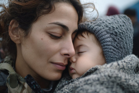 In a moment of deep connection, a mother cradles her sleeping baby close during an evacuation. They share warmth and comfort amidst difficult times.