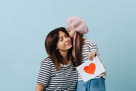 Tween girl in french beret kissing her mom, she's holding a paper sheet with scarlet heart on it. Over blue background.