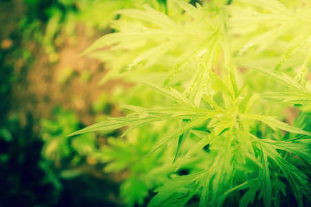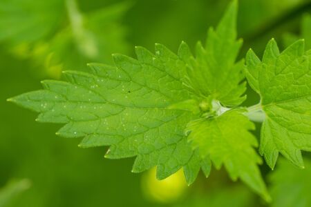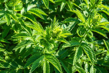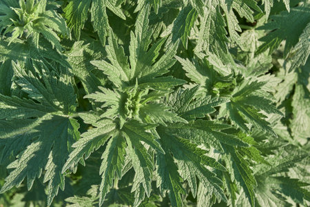 Herb plant motherwort in the herb garden, used as cardiotonic medicine. Leonurus cardiaca green leaves, close up.