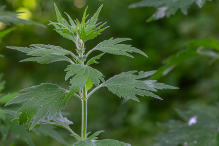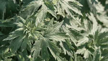 Macro shot of green motherwort leaves with serrated edges. Medicinal herb known for calming and heart-supporting properties, captured in outdoor sun lighting. Leonurus cardiaca