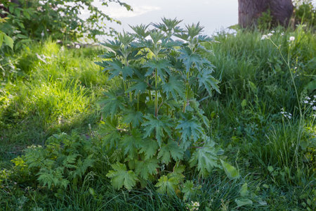 Bush of the young motherwort, species of Leonurus quinquelobatus, growing on meadow on the shore of a pond in spring sunny morning