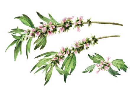 Motherwort, medicinal plant with flowers and green leaves set. Hand drawn watercolor illustration, isolated on white background