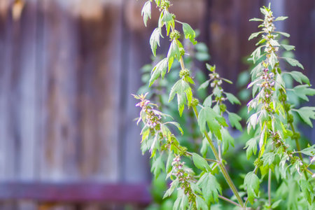 Leonurus cardiaca plant with green stem and leaves. Medical plant growing in a rustic vegetable garden.