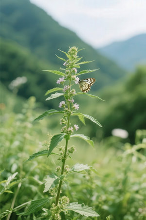 Butterfly on a flower in the meadow with mountains in the background