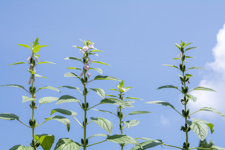 Pale purple sesame flowers and pods under sky with clouds