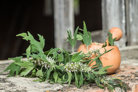 Leonurus cardiaca, motherwort, throw-wort, lion's ear, lion's tail medicinal plant In wooden plate. Ingredient for cosmetology and non-traditional medicine. Blooming in summer.