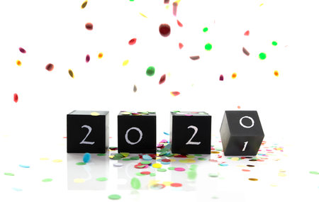 Wooden Blocks With 2021 Number On Table and confetti isolated on white